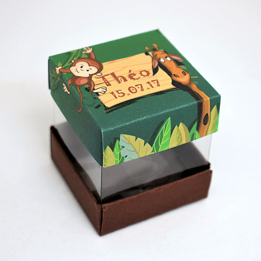 Boite à dragées personnalisée Jungle vert | modèle cube transparent